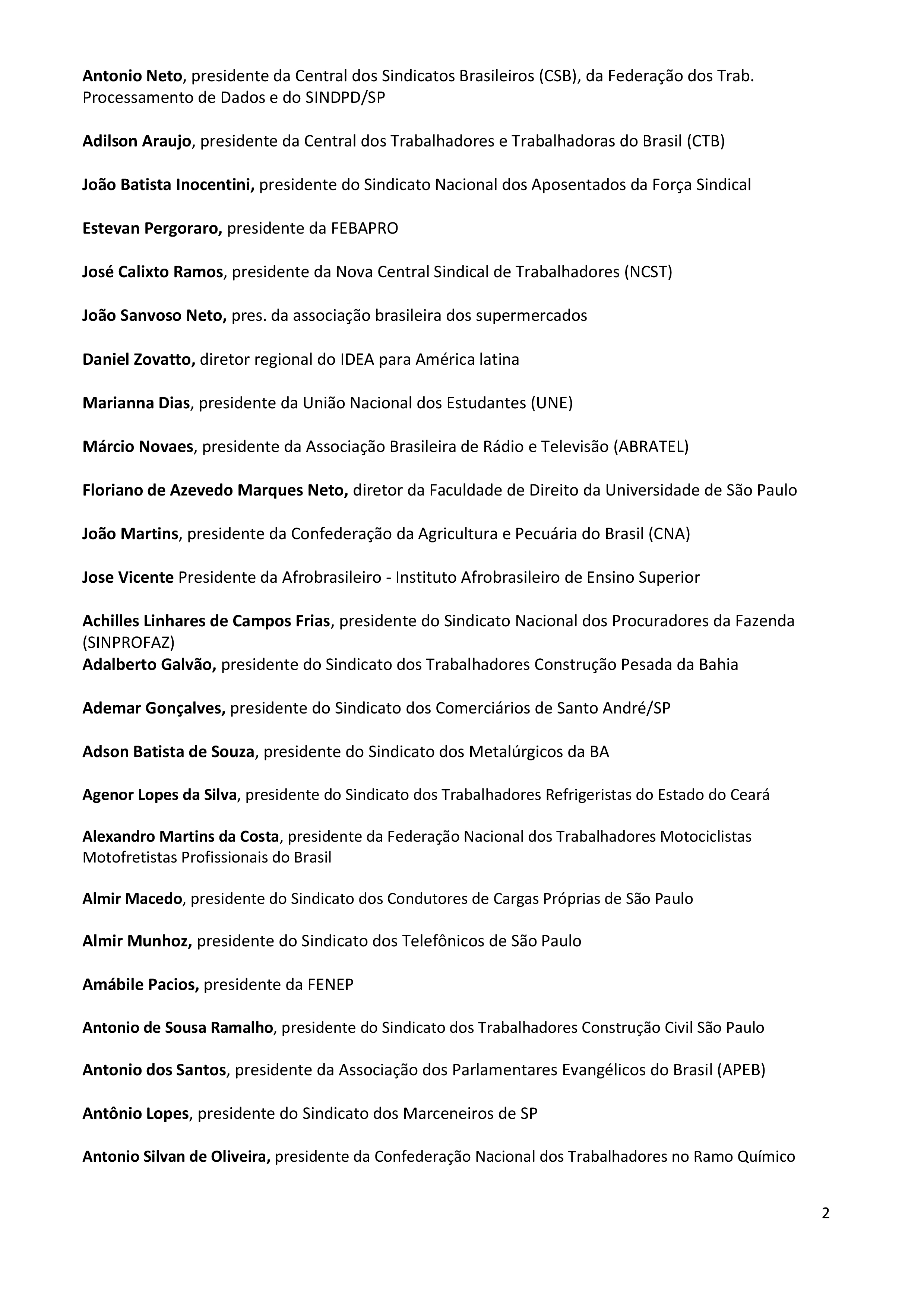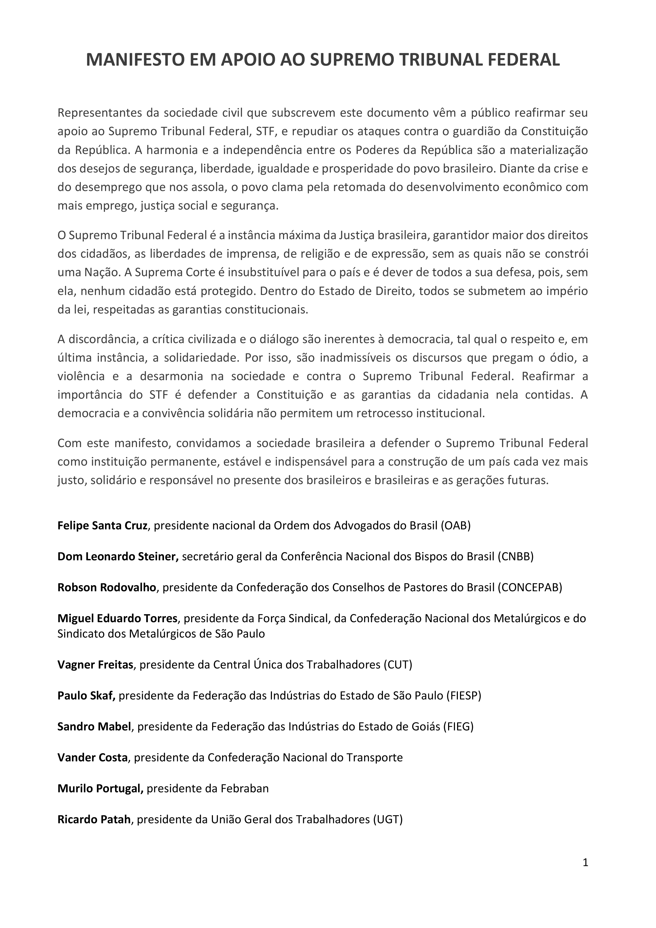 Um documento, assinado por mais de 100 lideranças, em apoio do Supremo Tribunal Federal (STF) foi apresentado nesta quarta-feira, no salão nobre do STF em Brasília. As lideranças que assinam o documento são representantes de trabalhadores, empresários, estudantis, religiosos, bancos, jurídicos, entre outros. O documento cita que é “são inadmissíveis os discursos que pregam o ódio, a violência e a desarmonia na sociedade” e que “A democracia e a convivência solidária não permitem um retrocesso institucional”.